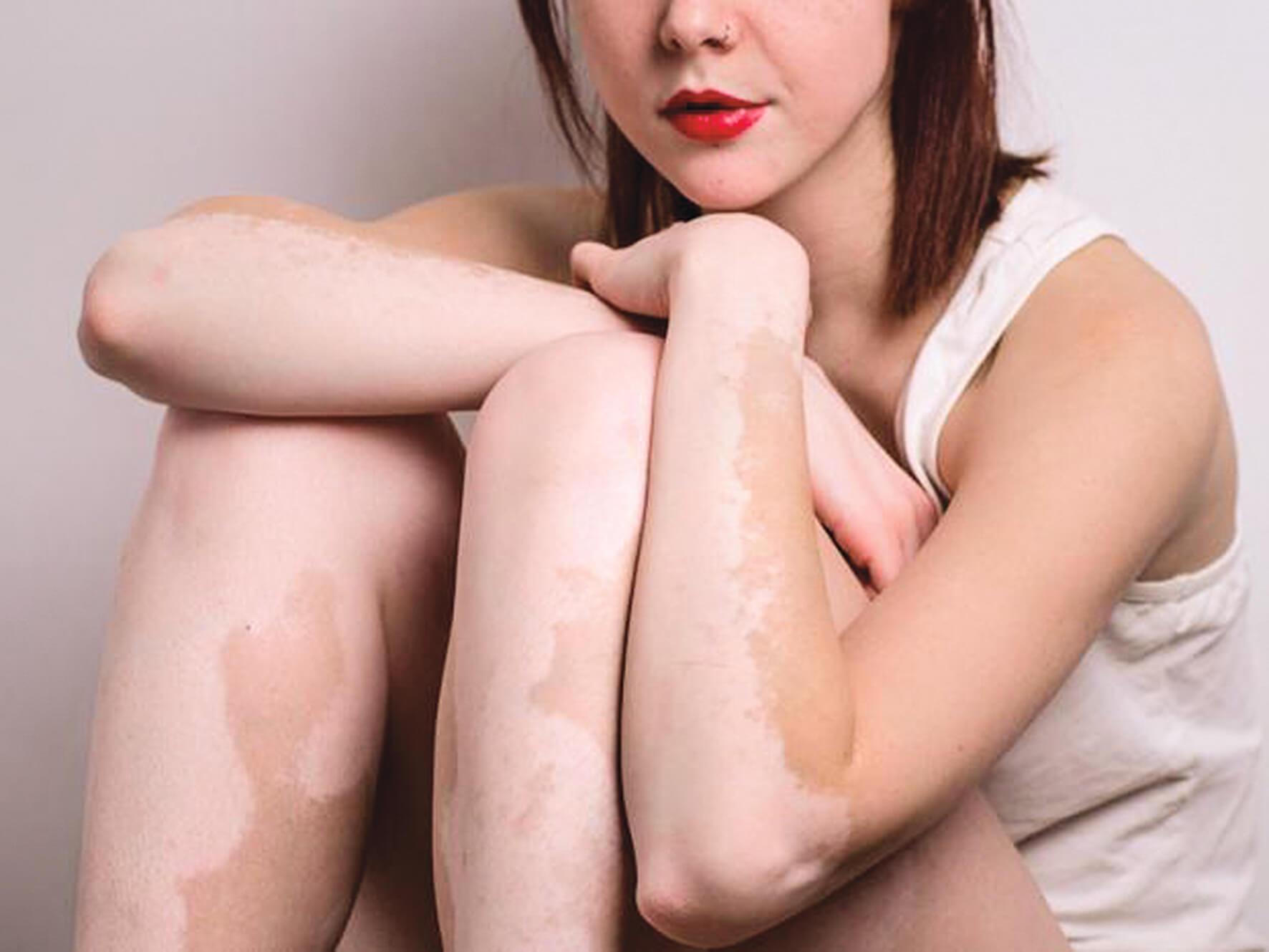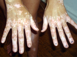 El vitiligo causa manchas blancas en la piel. También afecta ojos, boca y nariz. Ocurre cuando se destruyen las células que dan color a la piel a través de la producción de melanina. No se conoce la causa de la destrucción celular. Es más común entre las personas con enfermedades autoinmunes y puede tener una tendencia familiar. Suele comenzar antes de los 40 años.